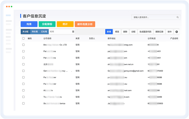 沉淀客户跟进信息、邮件信息;一键实现客户背调;管理繁多的产品品类,并与客户进行关 联;导出客户基本信息、邮件及联系人信息等