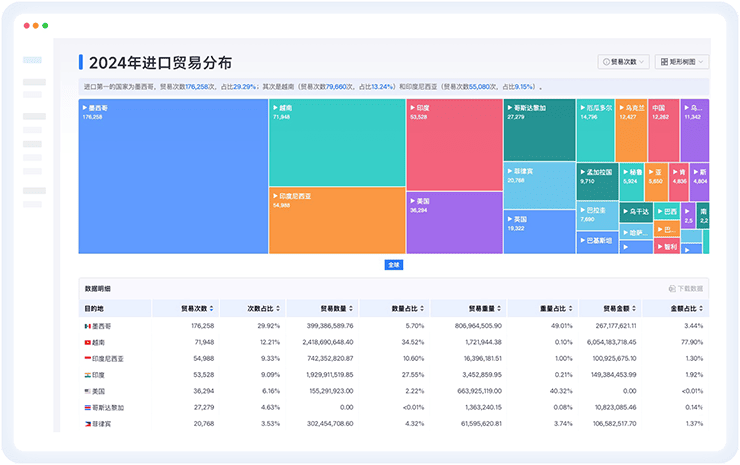 • 精准分析全球目标进出口国家的分布,进出口关单详情